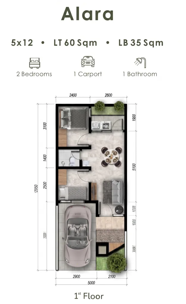 🏡 Tipe: Alara 1 lantai | 📐 Luas Tanah: 60 m² | 🏗️ Luas Bangunan: 35 m² | 🛏️ Kamar Tidur: 2 | 🛁 Kamar Mandi: 1 | 🚗 Carport: 1 Mobil | 🏘️ Cluster: Morizono | 🌿 Konsep: The Art of Japanese Living