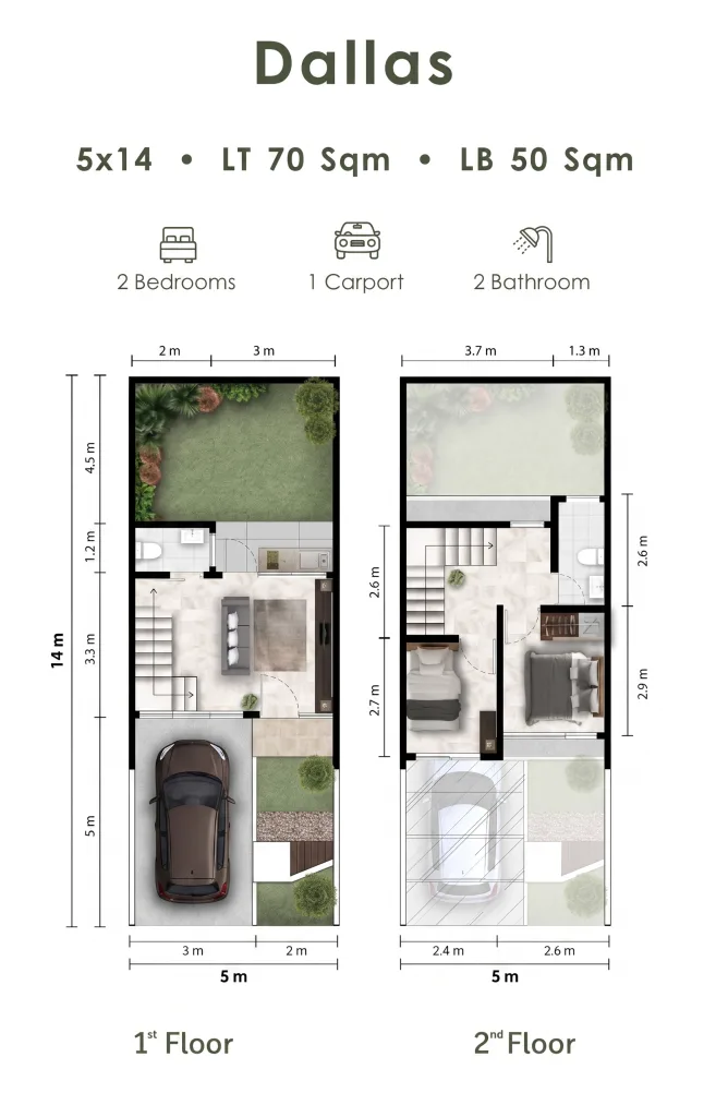 🏡 Tipe: Dallas 2 lantai | 📐 Luas Tanah: 70 m² | 🏗️ Luas Bangunan: 50 m² | 🛏️ Kamar Tidur: 2 | 🛁 Kamar Mandi: 2 | 🚗 Carport: 1 Mobil | 🏘️ Cluster: Morizono | 🌿 Konsep: The Art of Japanese Living
